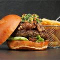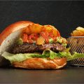 קציצה של 220 גרם בובו בורגר עם חסה, עגבניה, מלפפון חמוץ, חזה אווז צרוב, אסאדו מפורק, ריבת בצל ורוטב הבית