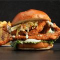 צי'קן בורגר עסיסי וקראנצי, מונח על לחמניית בורגר, רוטב ברביקיו ומלפפון חמוץ