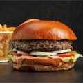 בורגר ״בקר״ צלוי על הגריל, מוגש על לחמניית הבית, חסה, ורוטב איולי שום טבעוני